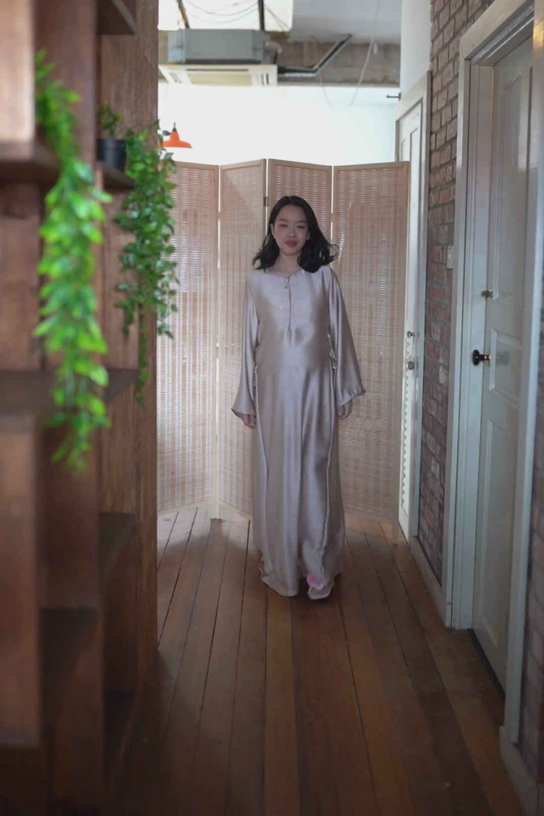 I tried it on immediately after unwrapping, and I must say I am very happy with the Abaya overall! The design is beautiful, the material is soft and flowy, and the workmanship is immaculate. When I purchase Abayas, I prioritise two key factors: fabric transparency and height. Firstly, the fabric is opaque, so that's a win! Secondly, despite being a size up for me, it doesn’t drag on the floor. So that is another win! It is slightly snug in the armpit area, but otherwise, I am satisfied overall and would consider getting it in a different colour now!