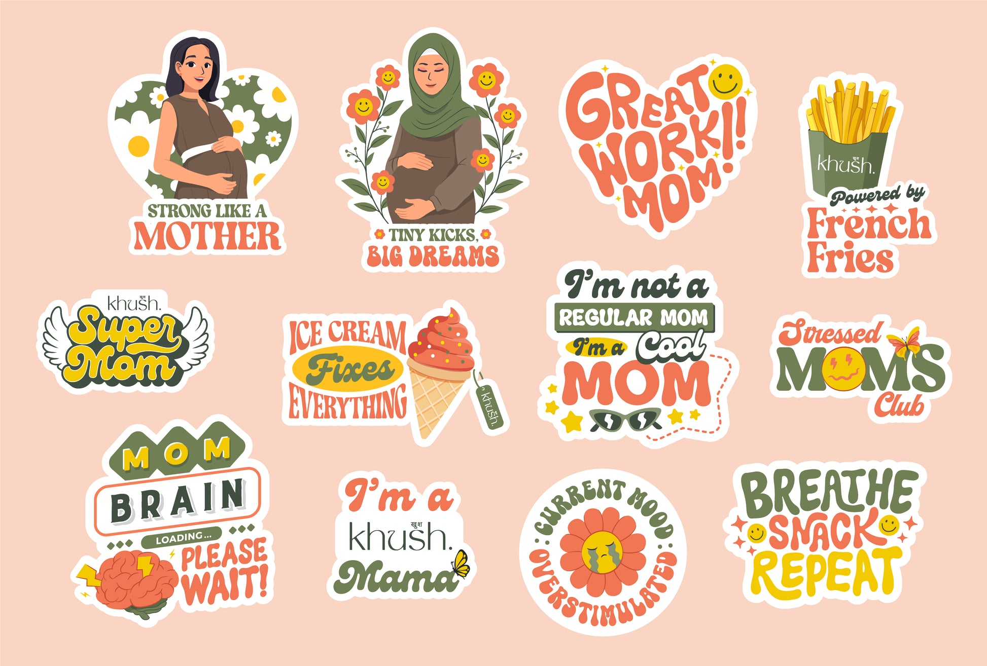 These 12 waterproof custom stickers were created to celebrate the launch of our first line, the Basics Collection. Use them on your bottles, phones, or whatever you can think of, and celebrate being an awesome mama and/or human, in style!